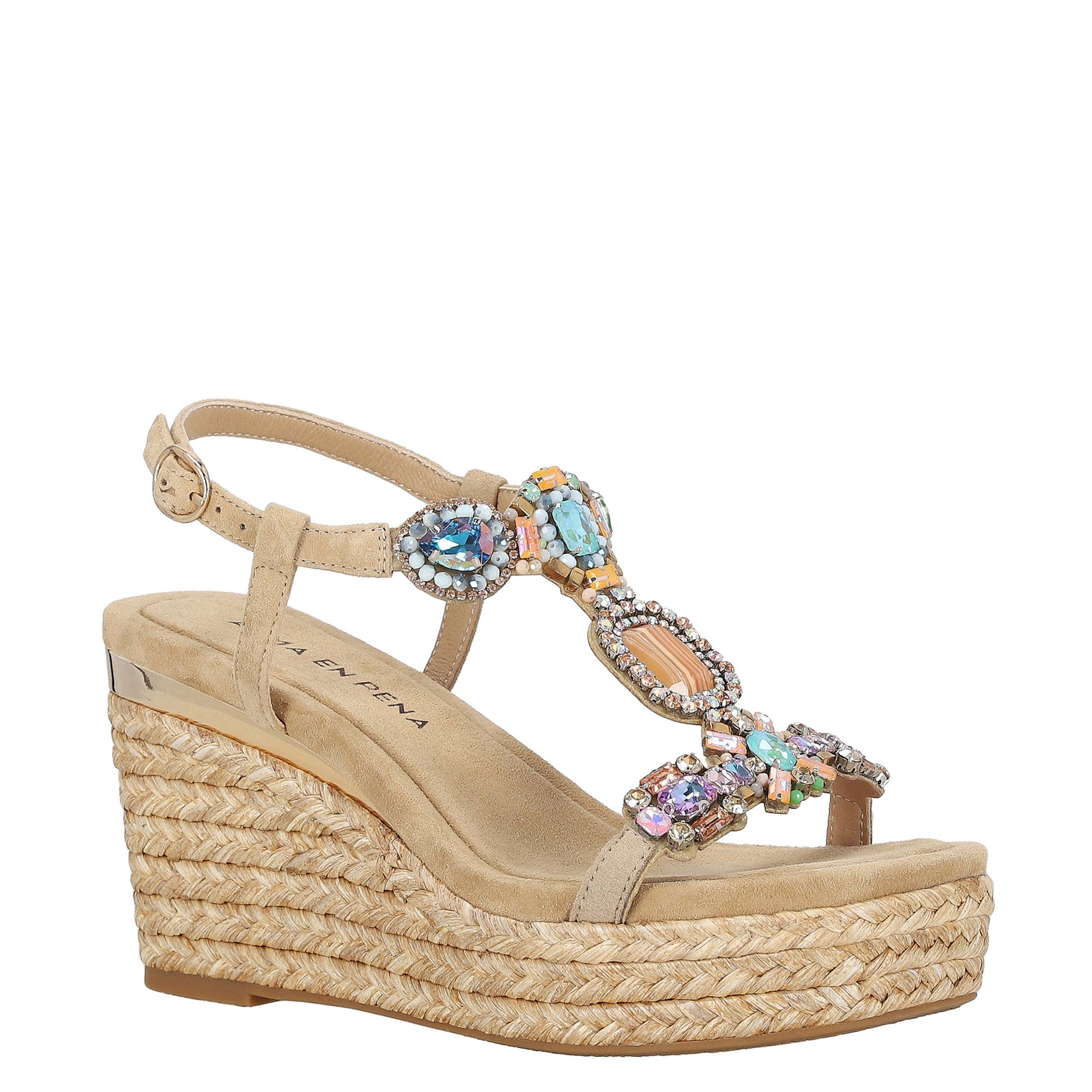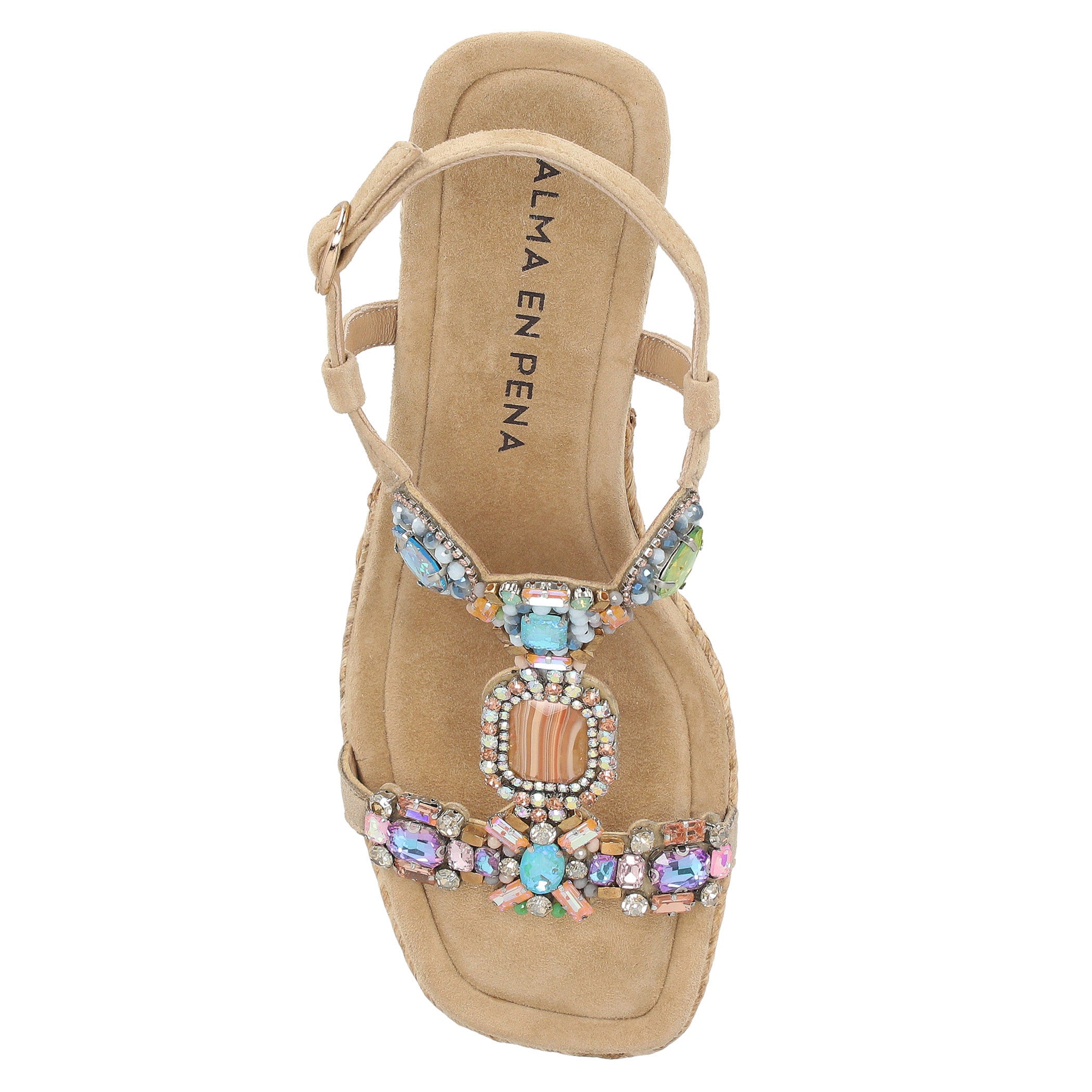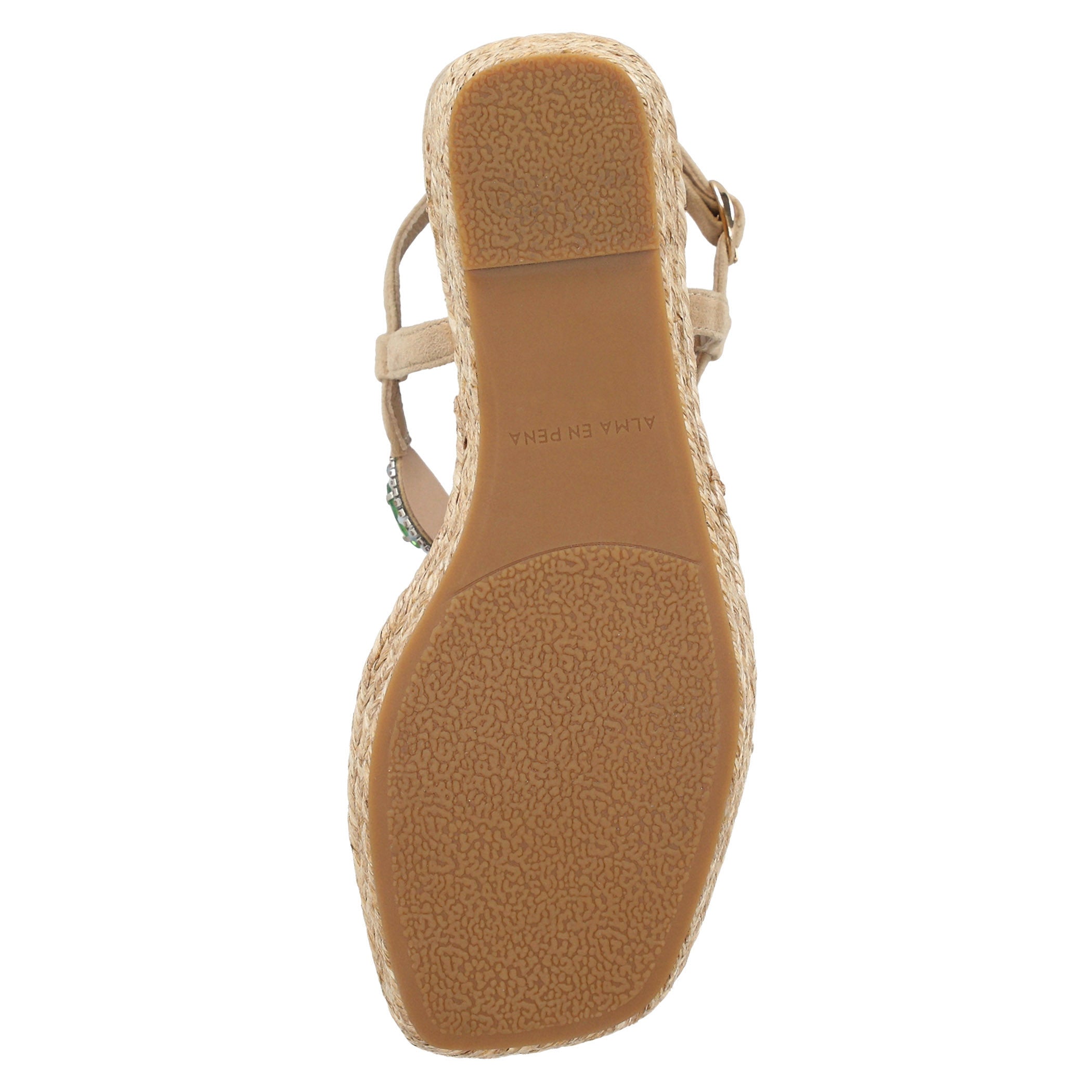 Zapatilla con plataforma Alma en Pena para mujer elaborada en piel con textura tipo gamuza, con aplicaciones de pedrería que aportan un brillo delicado y sofisticado. Su diseño de acabado liso con punta cuadrada y cierre de hebilla ofrece una estética elegante y actual, mientras la plataforma forrada en yute brinda altura y estabilidad para elevar looks de temporada con frescura y estilo.