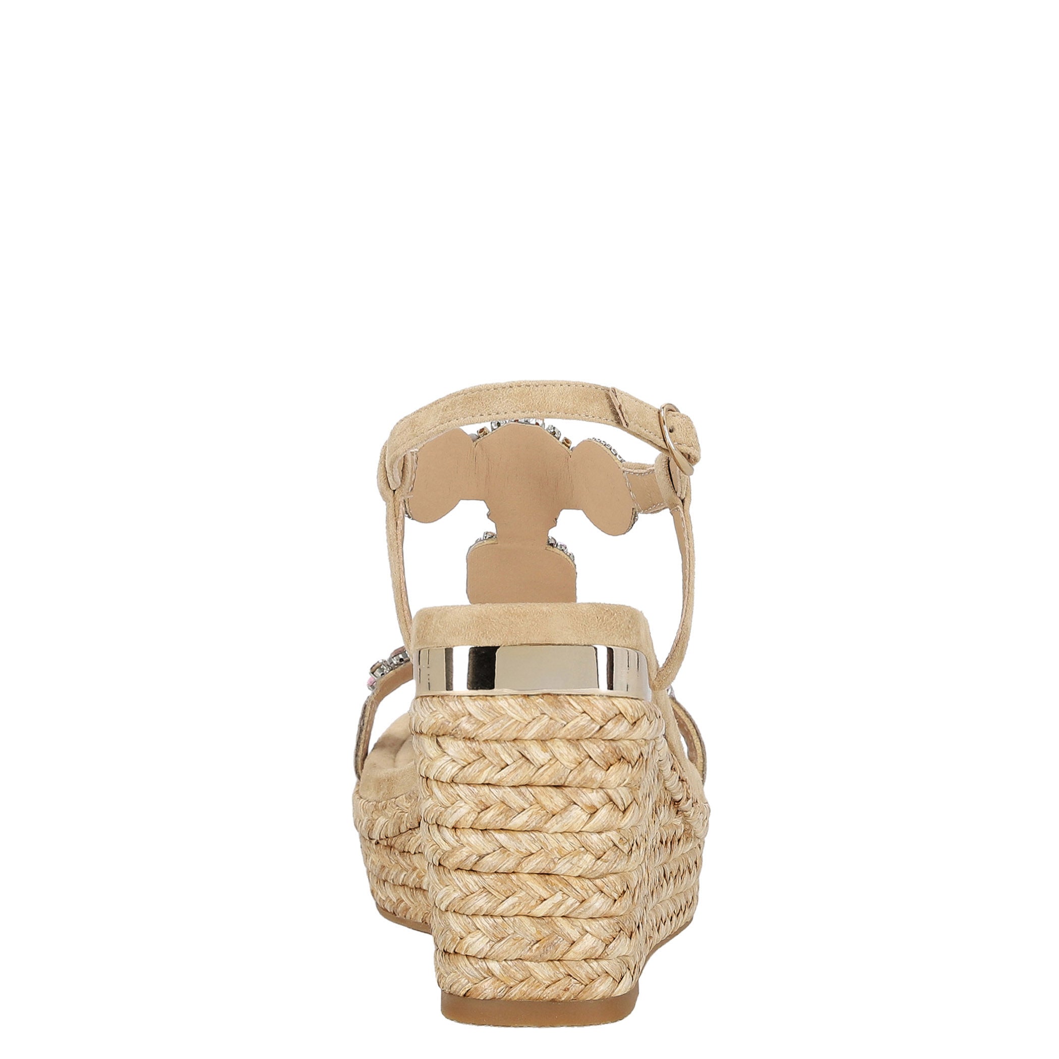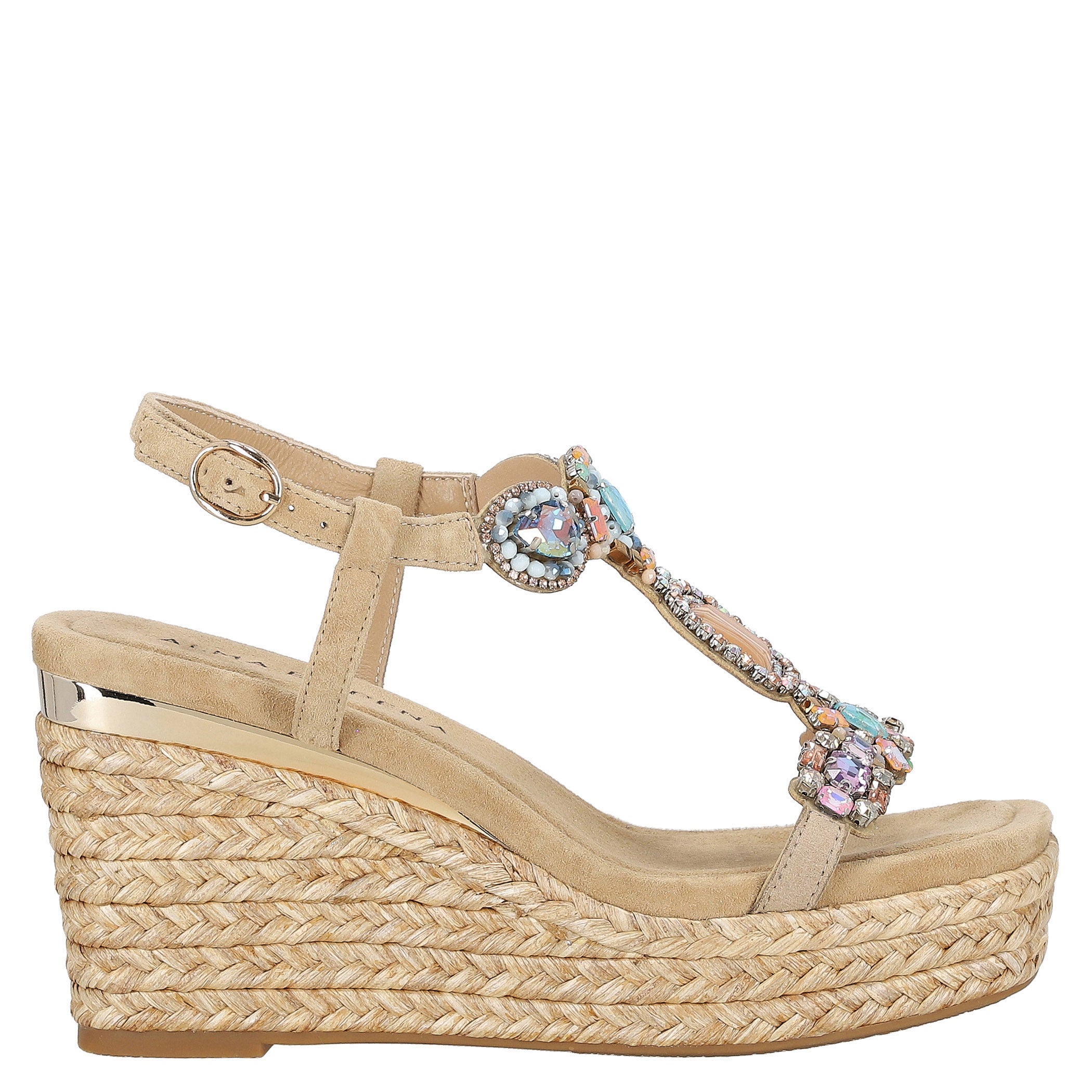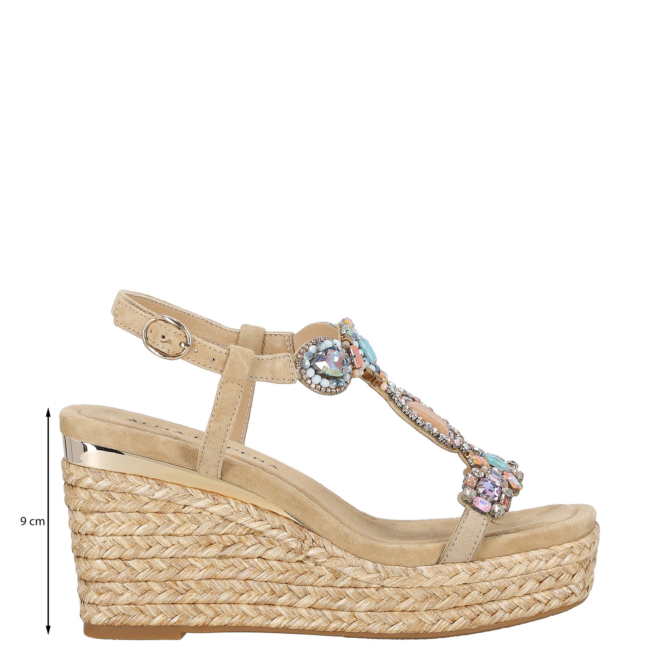 Zapatilla con plataforma Alma en Pena para mujer elaborada en piel con textura tipo gamuza, con aplicaciones de pedrería que aportan un brillo delicado y sofisticado. Su diseño de acabado liso con punta cuadrada y cierre de hebilla ofrece una estética elegante y actual, mientras la plataforma forrada en yute brinda altura y estabilidad para elevar looks de temporada con frescura y estilo.