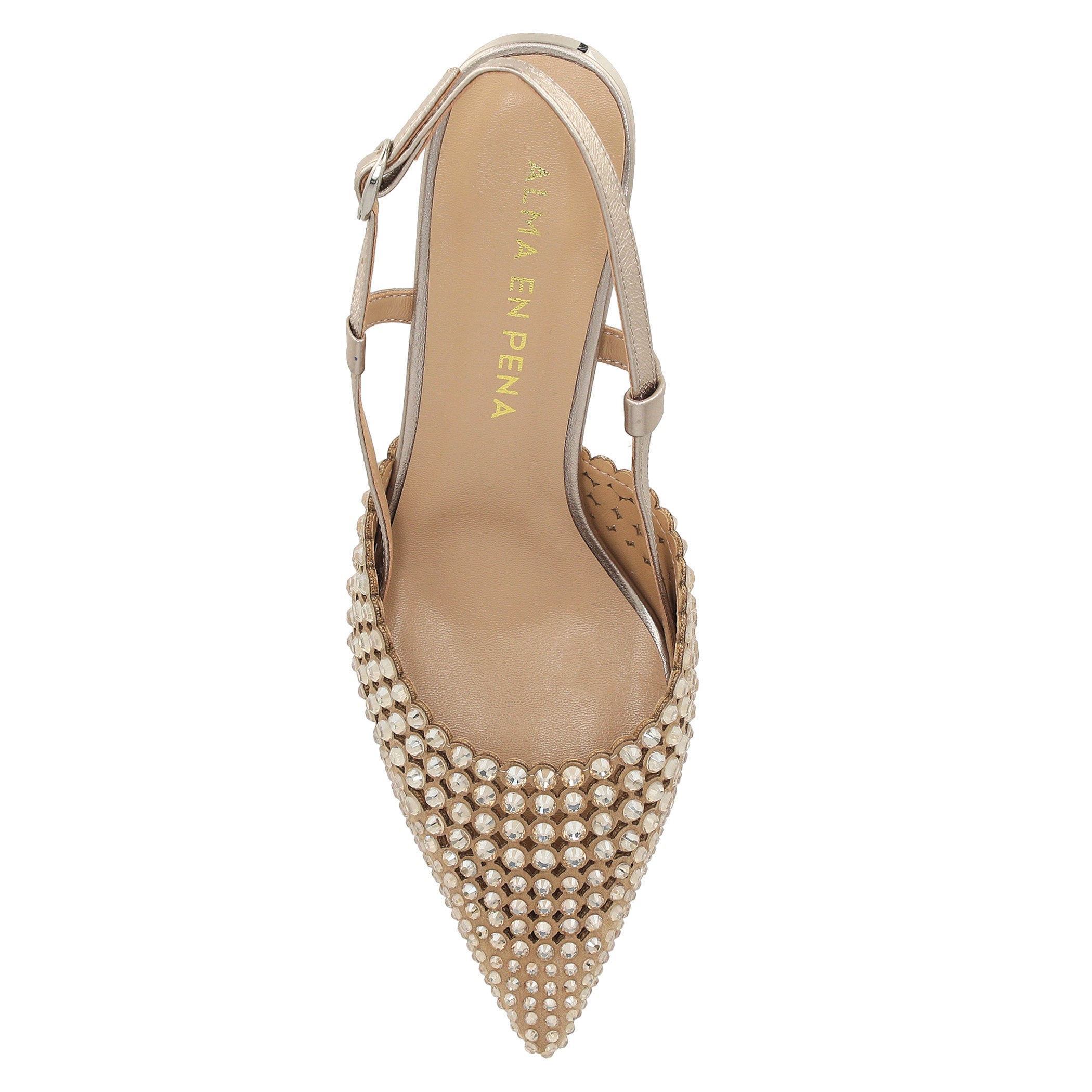 Esta zapatilla Alma en Pena para mujer fusiona elegancia y brillo en una silueta refinada y contemporánea. Elaborada en piel, su diseño se distingue por una aplicación de pedrería que cubre el empeine y aporta un efecto joya sofisticado. La fijación con hebilla permite un ajuste delicado y femenino, mientras que la punta puntal y el tacón de 7 cm estilizan la figura con un equilibrio perfecto entre altura y comodidad. Ideal para ocasiones especiales o para elevar looks de noche con distinción.