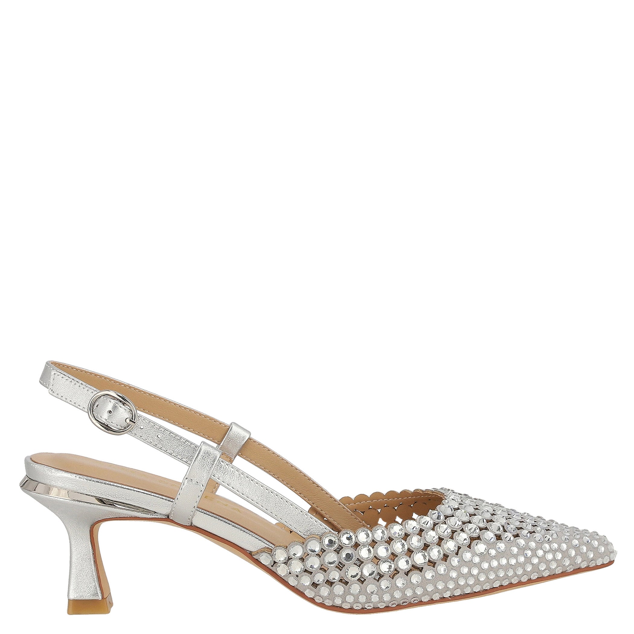 Esta zapatilla Alma en Pena para mujer fusiona elegancia y brillo en una silueta refinada y contemporánea. Elaborada en piel, su diseño se distingue por una aplicación de pedrería que cubre el empeine y aporta un efecto joya sofisticado. La fijación con hebilla permite un ajuste delicado y femenino, mientras que la punta puntal y el tacón de 7 cm estilizan la figura con un equilibrio perfecto entre altura y comodidad. Ideal para ocasiones especiales o para elevar looks de noche con distinción.